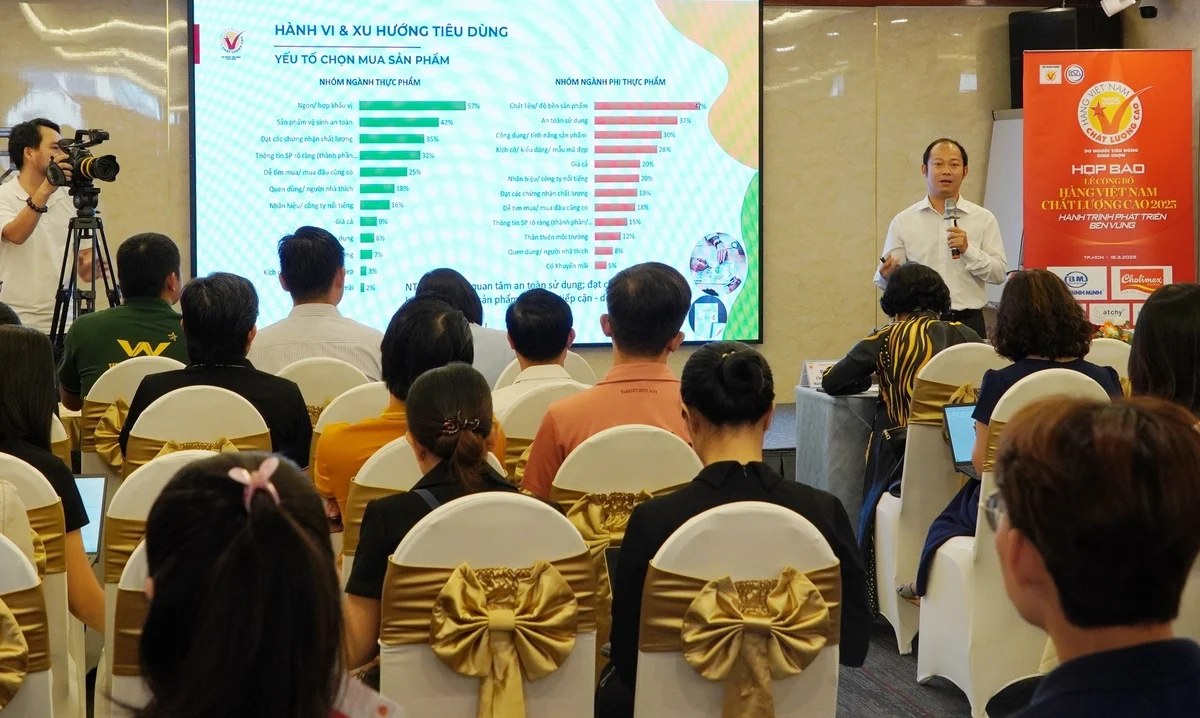 Ông Nguyễn Văn Phượng, phụ trách khảo sát Hàng Việt Nam chất lượng cao chia sẻ tại sự kiện họp báo công bố danh sách 562 doanh nghiệp đạt nhãn hiệu Hàng Việt Nam chất lượng cao năm 2025, ngày 18/3. Ảnh: Nguyễn Thủy.