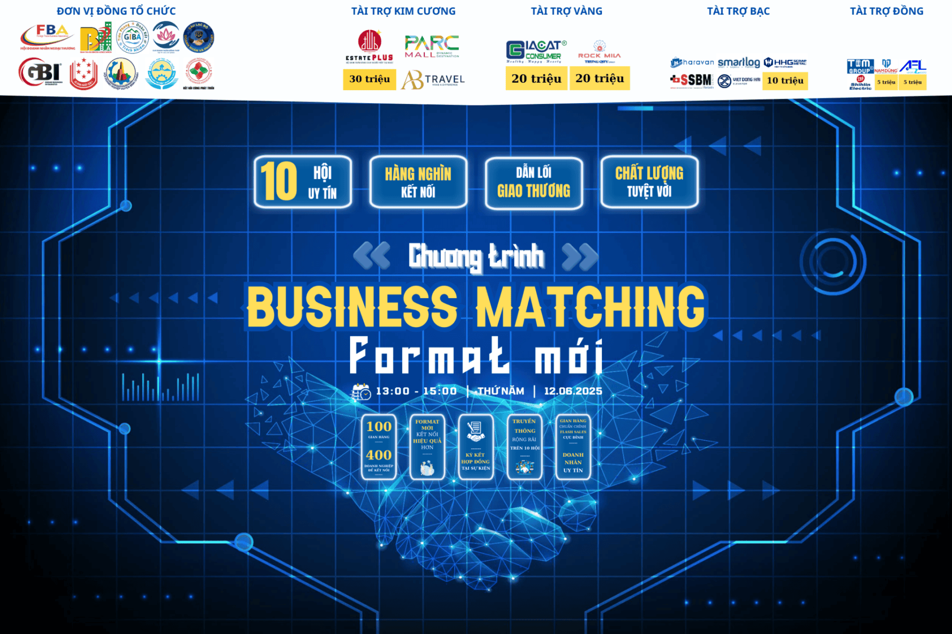 - Nhà tài trợ Kim Cương: Được giới thiệu sản phẩm, dịch vụ và nhu cầu kết nối trên sân khấu chính (tối đa 2 phút), tiếp cận trực tiếp với toàn bộ khách mời tham dự.